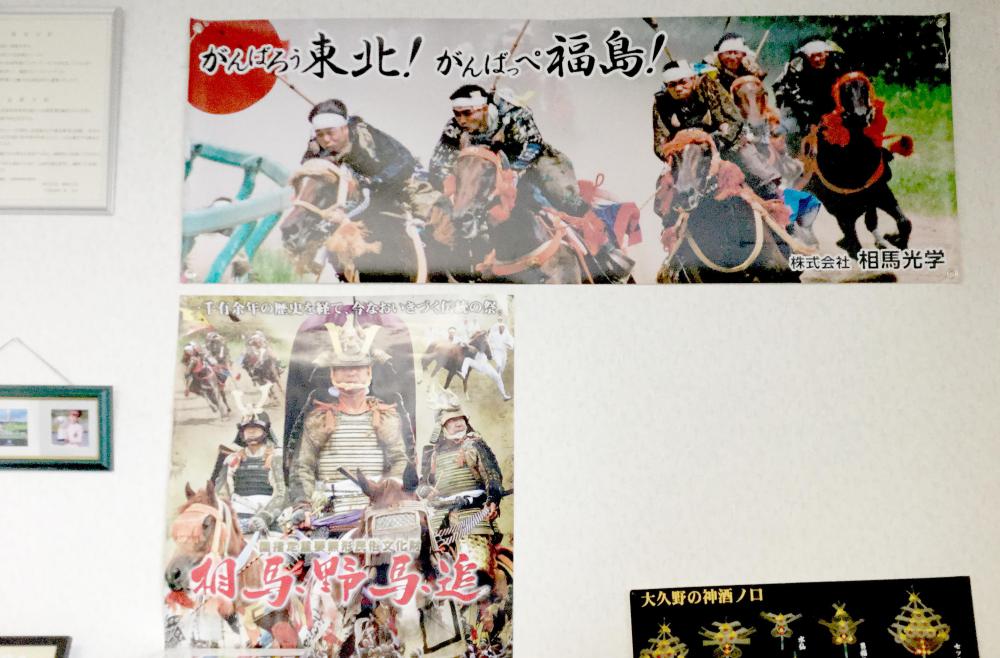 社長室の壁に貼られているのは、故郷東北を応援するために制作したポスター。相馬光学の名前の由来は、会長の愛するふるさと、南相馬からきています。