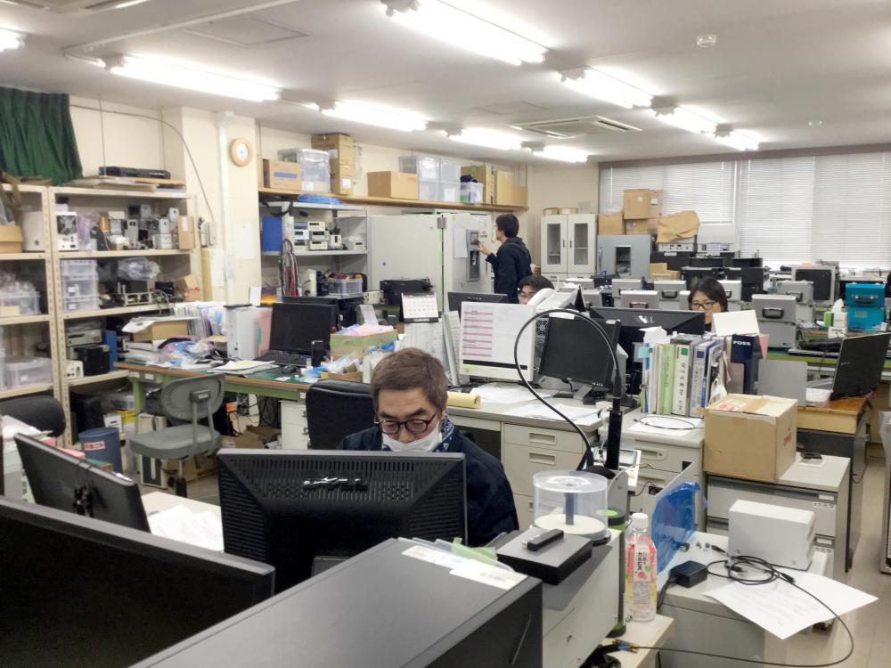 技術2課は、電気、機械光学、ソフトウェア、評価分析のプロフェッショナルからなるチームです。スペシャリストたちが、この部屋で製品の設計をしています。