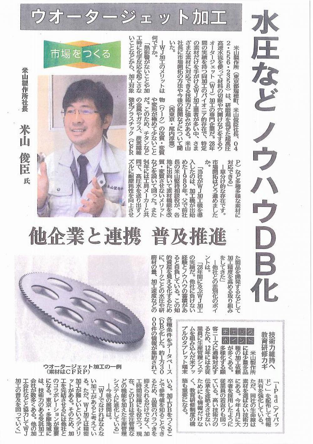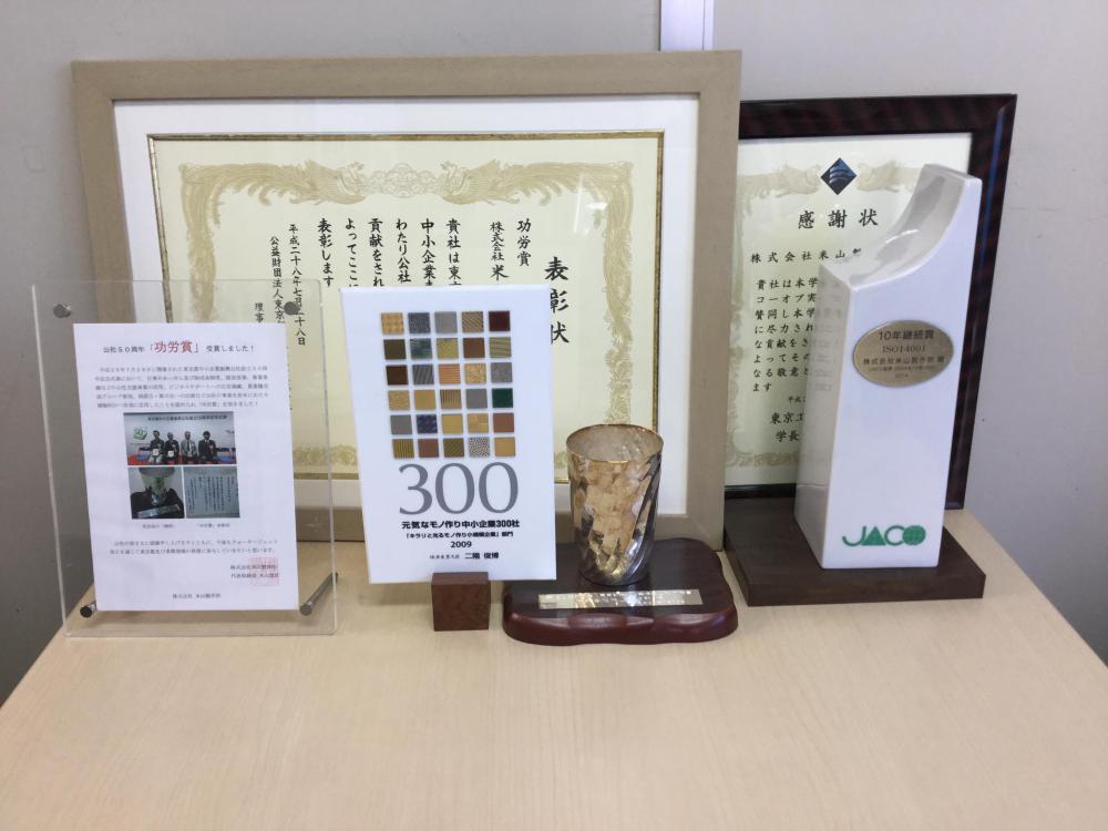 日本でウォータージェット加工が普及する前から、いち早く設備を導入し、さらに、今ではどの企業でも当たり前となっている他社との協業などにも他社に先駆け取り組んでいたことにより、各マスメディアに取り上げて頂いたり、東京都中小企業振興公社や自治体、官公庁より数多く表彰頂けております。
