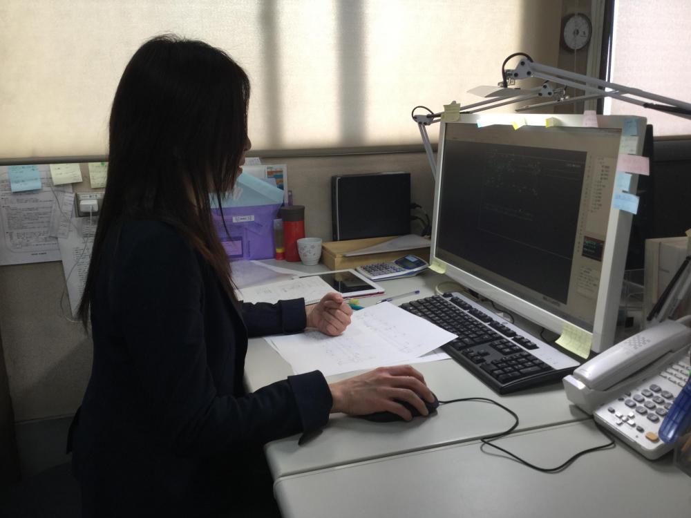 私は、事務と図面のデータ化を担当しています。入社当時は、事務を行いながら空いている時間にデータ化の勉強を行い、今ではすべてのデータ化をひとりで行っています。