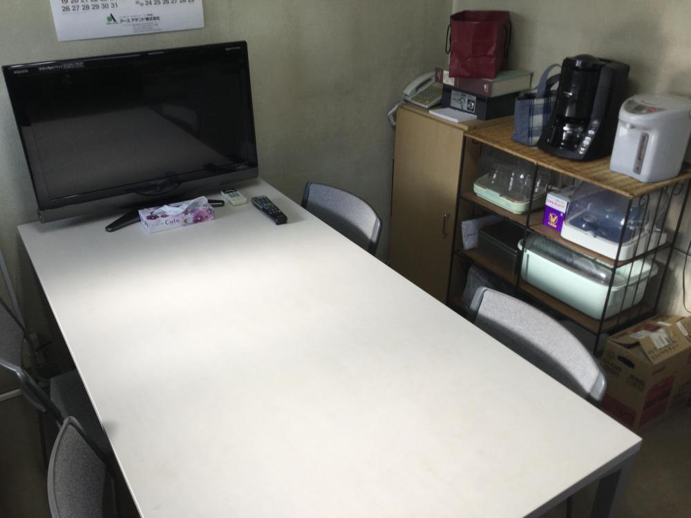 ここは2階にある休憩室。お昼休みはこの部屋で食事をとります。仕出しのお弁当を購入する社員が多いですね。事務所の外には、自動販売機があり、100円で購入できます。