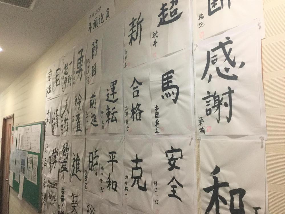 また、今年は年始に書初めもしました。今年の目標や、大切にする言葉など書きまして、廊下に貼りだしています。みんな学生の頃を思い出して、一生懸命書いてました。筆で書くのは意外と難しいですよね(笑)