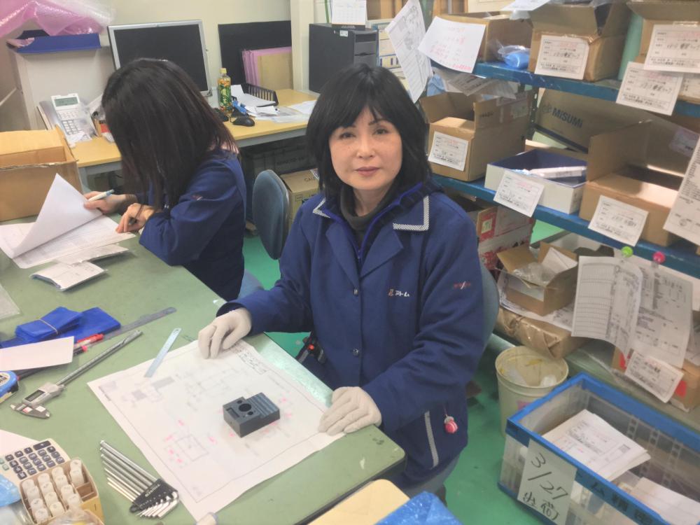 資材部門で検査を行っています。アトム精密の働きやすいところは、子供の都合などで休んだり早退したりすることがあっても、周りの人が優しく接してくれることです。周囲の人の対応によっては、休みづらさを感じるんでしょうが、この会社ではそういうことは全くありませんので、働きやすいです。