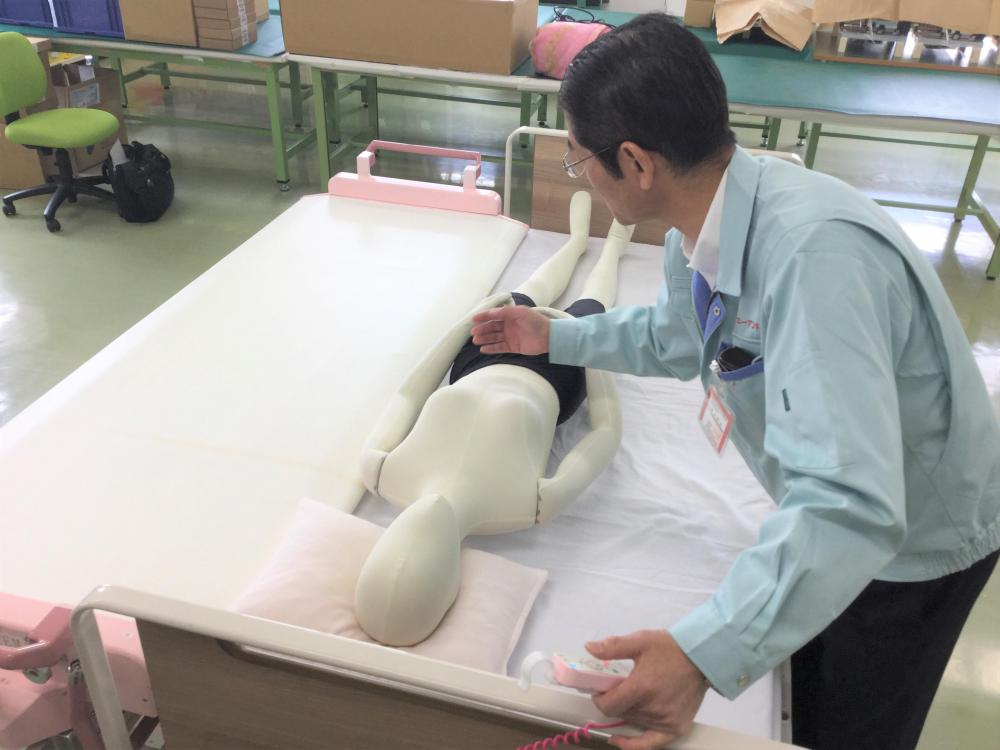 これまで培った技術で、医療・介護業界向けに商品を開発・設計・製造、製品試験まで自社で一貫して行っています。写真上は、手術後の患者をスムーズかつ安全に病室ベッドに移動できる「パスシステム」という商品と、高齢者向けのトレーニング装置「ステップ・パルサ」です。