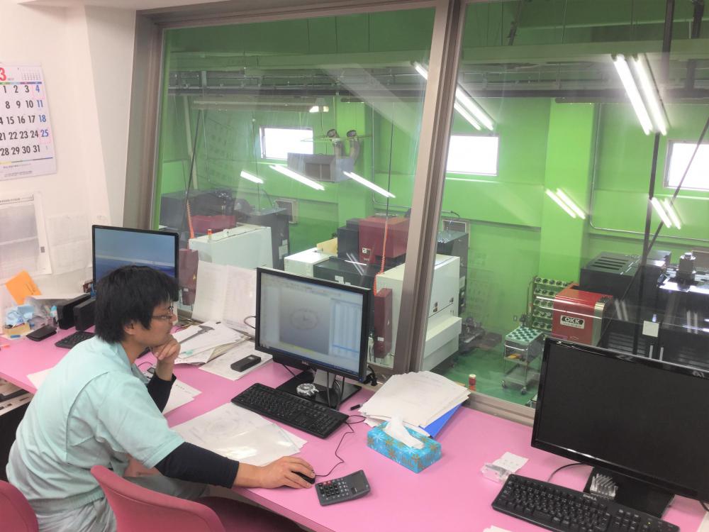 こちらは2階にある、CAD室です。全体的にピンク色を基調としています。プログラミングを行い、下の現場に送っています。PCの前はガラス張りとなっており(写真下)、1階にある現場を直接見ることができるようになっています。