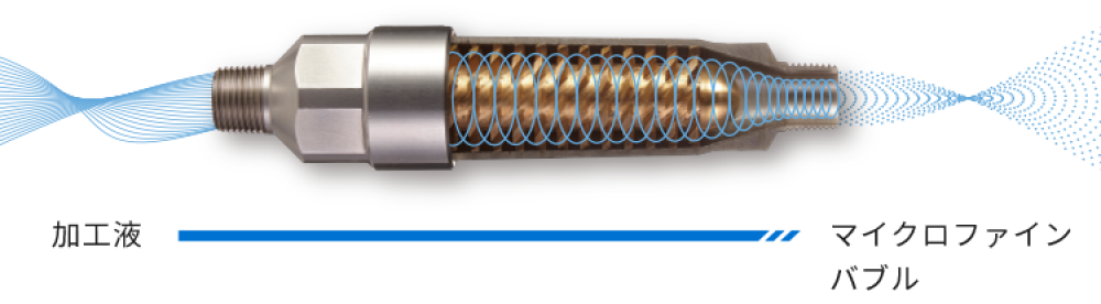 この「流体せん断装置 SIO」を工作機械(研削盤、マシニングセンター)に設置するだけで、お使いの加工液が大幅に性能向上され、桁違いの冷却効果、桁違いの洗浄効果を発揮します。