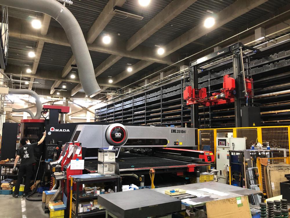 12段×18列の世界最長・最速の材料自動倉庫HYPER MARS。 時代は小ロット・多品種により、いろいろな種類の材質・板厚を在庫しなくては加工ができない。 すると、「即日板金」が不可能になってしまう。HYPERMARSは、世界でも例を見ないほどの規模で材料をストックできます。