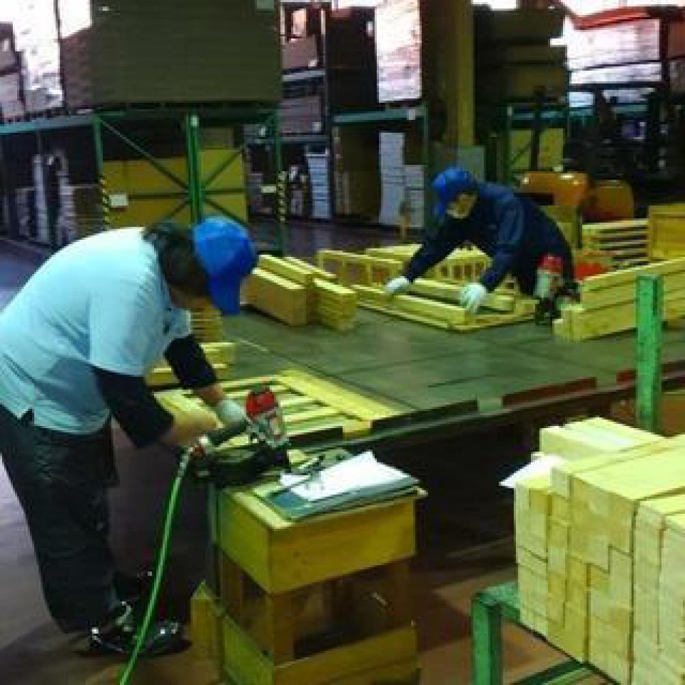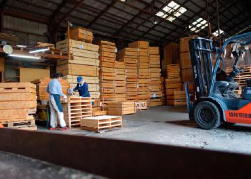 釘打ち機などの工具を使用して、指示通りに釘を打って木箱やパレットを組み立てる作業になります。