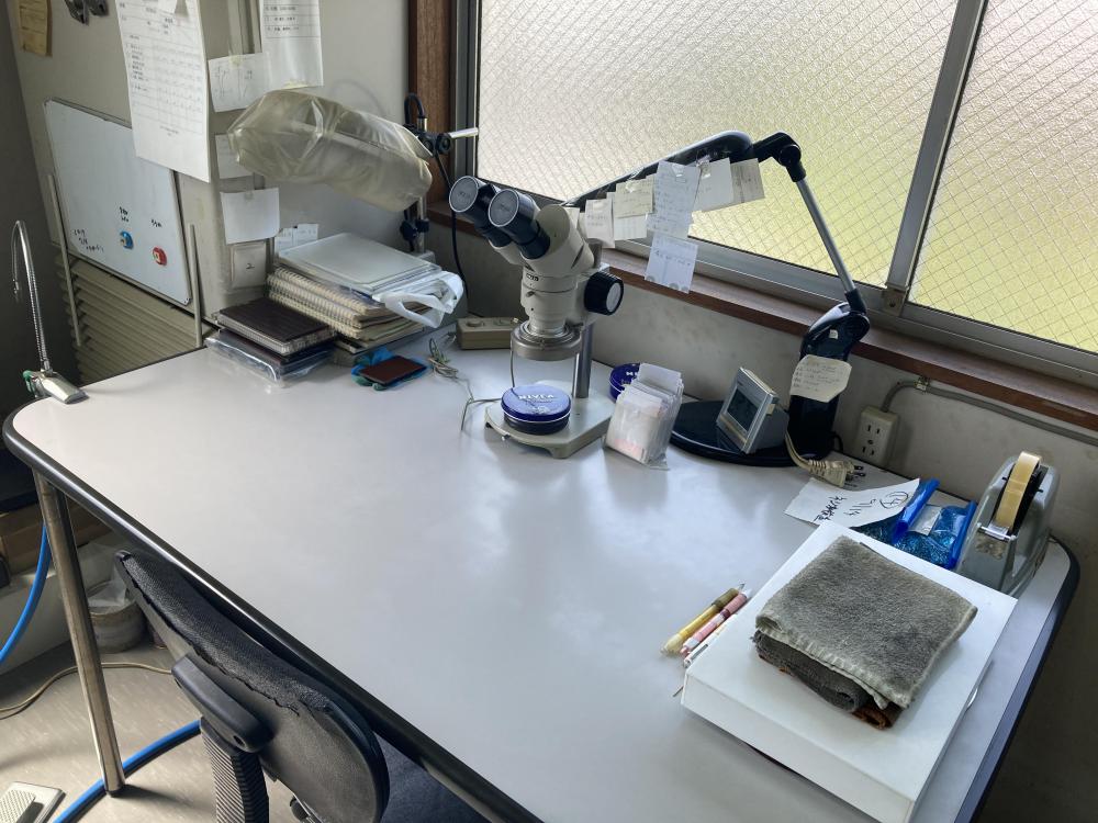 座りながら、顕微鏡および目視での作業です。細かいものを見るため、目を使います。
